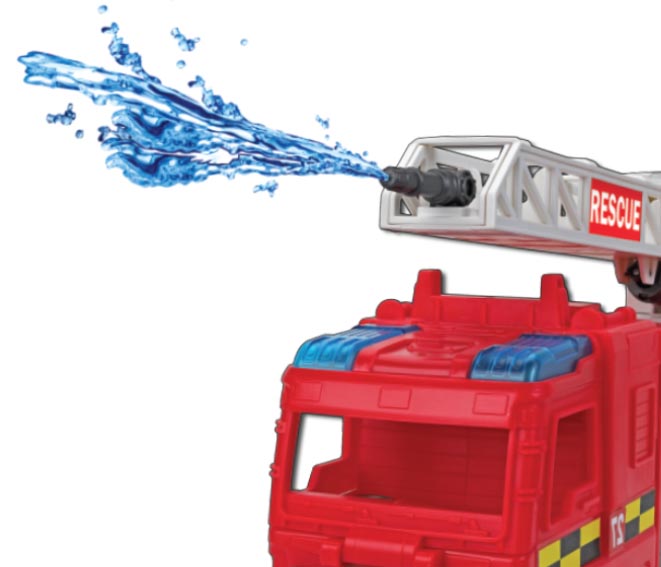 If there's a fire at the Motor Shop, have no fear… just climb aboard this deluxe fire engine to save the day! Pull out the extendable ladder for hard to reach areas. Pull out the water hose and go into action against the flames. Roll the truck along and press the buttons for siren lights and sounds. Best of all, you can really douse the flames with water, by filling up the tank, pumping it up, aiming and spraying! Flip open the cockpit to sit figures inside (figures sold separately). Open compartments for more firefighting tools. There are also safety cones and roadblock signs that can be stored on top of the truck or in the side compartment. With this fire engine, you're ready for any emergency!