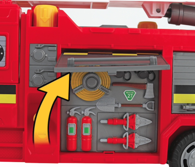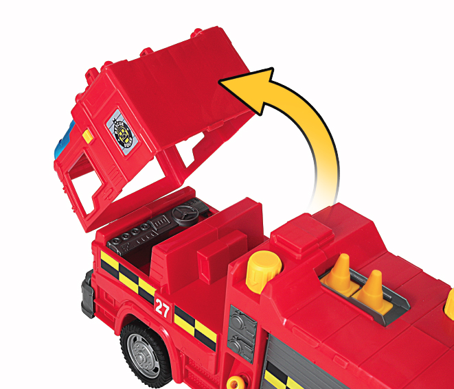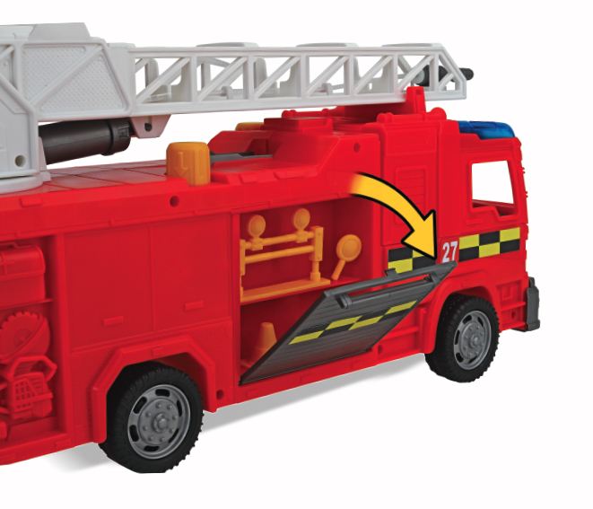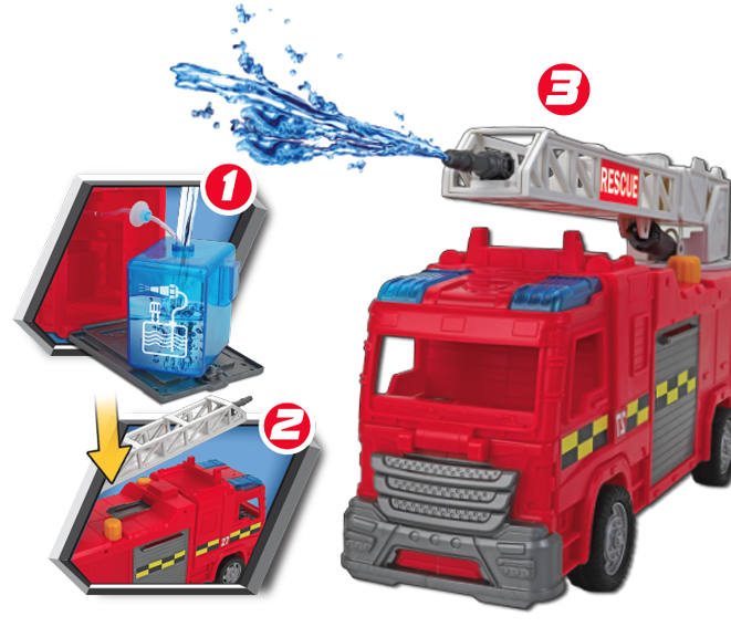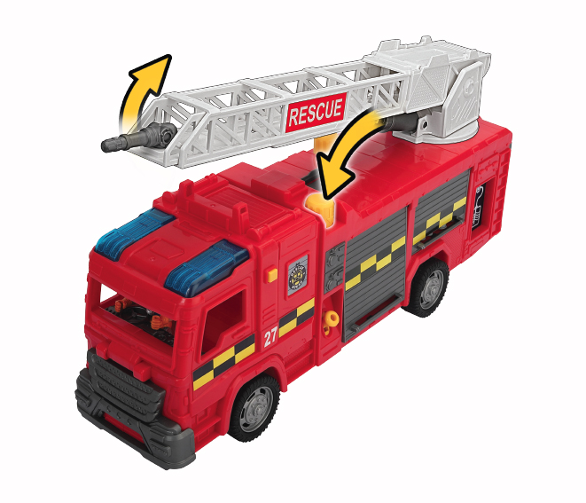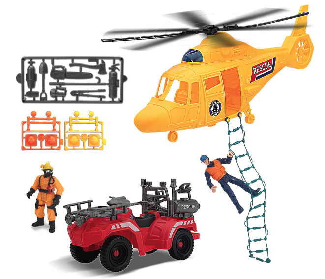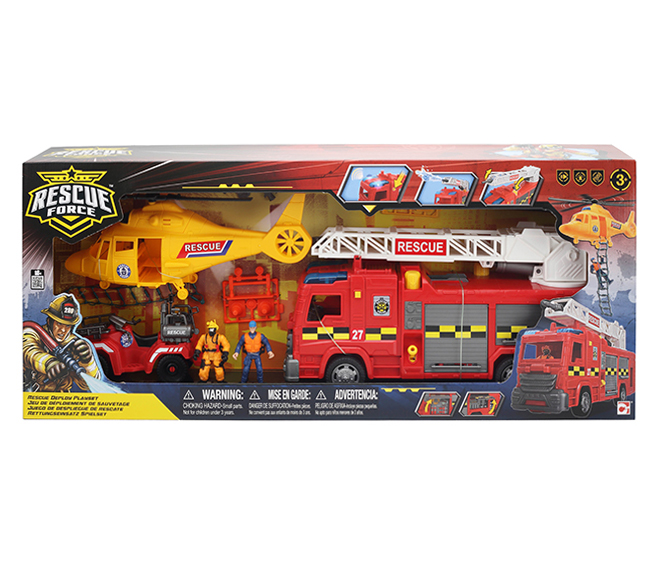 The Rescue Force is always on the move and ready to save the day, and you can help them be heroes! The free-wheeling fire engine features push-button siren lights and sounds, and an extendable ladder. A real-working water tank can be filled up and pumped, and the hose aimed and sprayed at a target! For those highest skyscraper rescues, swoop in with the rescue chopper and have one of the action figures climb down the ladder to help save victims. A free-wheeling SOS rover vehicle is built low and rugged to take on any terrain, making it a great vehicle to send into tight and tough spots. There are additional snap-on accessories for the two included action figures to use on their missions. Gear up and join these heroes as you save the day!