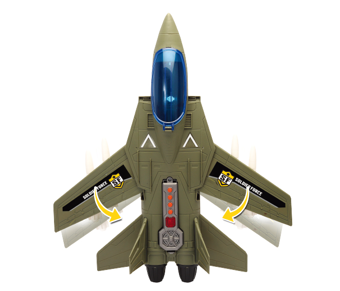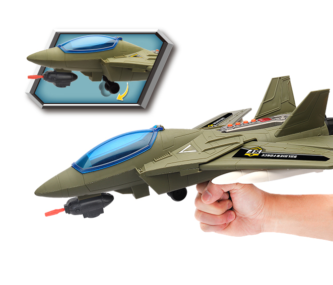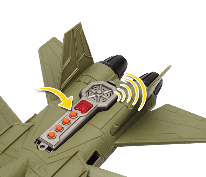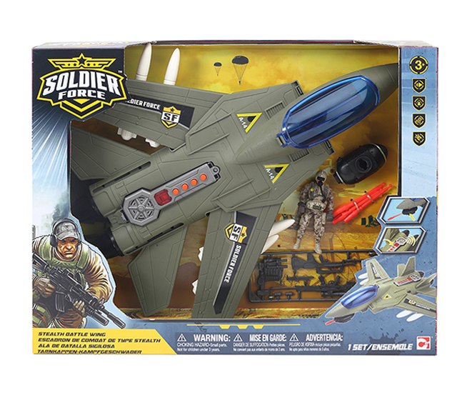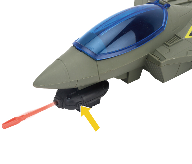 It's time to take on a secret mission in the Stealth Battle Wing! Fit the fully poseable action figure inside the cockpit of this jet fighter and pretend to fly him high above his foes' encampment to infiltrate the enemy territory. Time to unleash the jet's full firepower. Press the button for battle lights and sounds. Uh-oh, he's been spotted! It's also decked out with mini missile launchers – just press the button to mount your defense. Includes additional accessories and weapons.