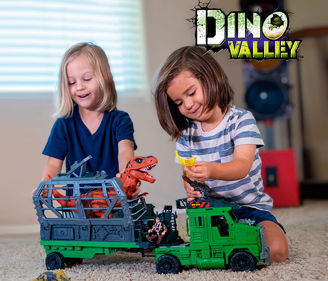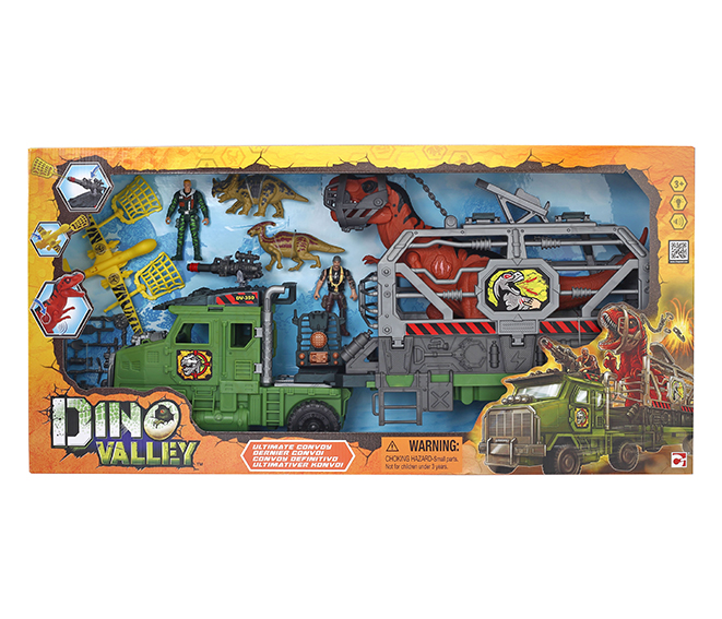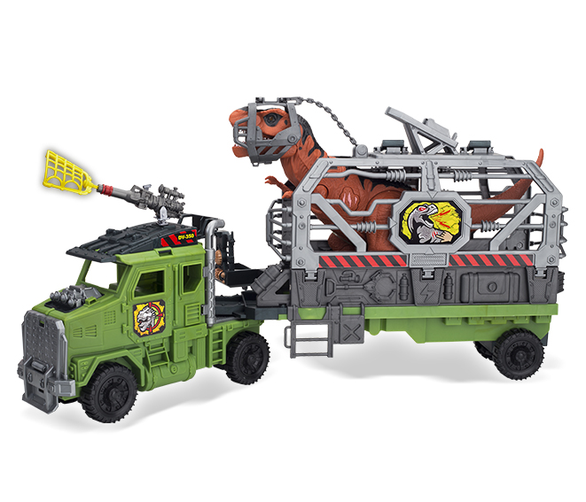 The Dino Valley Response Team has sent two of its bravest members out into the canyon to catch the huge T-Rex there! The duo also encounters a couple of other dinosaurs while on their mission, so it won’t be easy to bring the specimens back for study. Thankfully, they brought the Capture and Cage Truck. It’s equipped with a telescope so that the teammates can easily spot the dinosaurs wherever they may be. Insert the capture net and press the button to launch it toward the dinosaurs! Deploy the glider plane on top and shoot the net for taller dinos. Press the button on the T-Rex to see its eyes light up in a rage as it lets out a terrifying roar! The truck has special restraints that can be placed on the Rex so it can be placed in the truck and transported back to Dino Valley headquarters. The adventures never end in Dino Valley! Includes two poseable action figures.